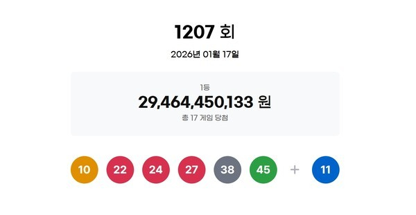 동행복권은 지난 17일 실시된 제1207회 로또복권 추첨 결과, 1등 당첨번호가 ‘10, 22, 24, 27, 38, 45’로 결정됐다고 발표했다. 2등 보너스 번호는 ‘11’이다.