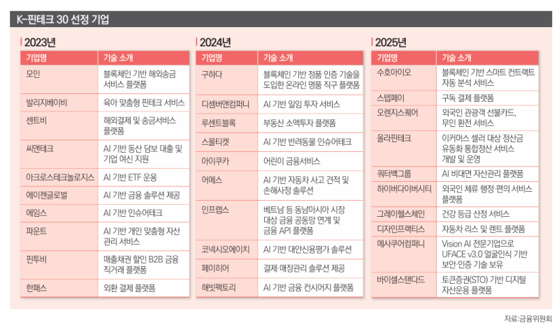 이 같은 인식은 핀테크 업계 전반에서 공유되고 있다. 결제·송금 중심의 소비자 금융을 넘어 인공지능(AI)·데이터·금융 인프라를 결합한 구조형 핀테크가 향후 유니콘으로 성장할 가능성이 크다는 평가가 지배적이다. 이러한 흐름은 주요 콘퍼런스와 정책 논의에서도 반복적으로 언급되고 있다. 금융위원회 주재로 열린 ‘코리아 핀테크 위크’ 역시 이러한 방향성을 집약적으로 보여주는 무대였다. 행사 기간 중에는 ‘K-핀테크 30’에 포함될 최종 기업들이 선정됐다. K-핀테크 30은 2023년부터 2025년까지 매년 10개씩, 총 30개 기업을 미래 금융혁신 대표기업으로 선정하는 제도다. 올해 선정을 끝으로 최종 명단이 완성되면서 국내 핀테크 생태계가 주목하는 차세대 핵심 기업군도 보다 뚜렷해졌다는 평가가 나온다.