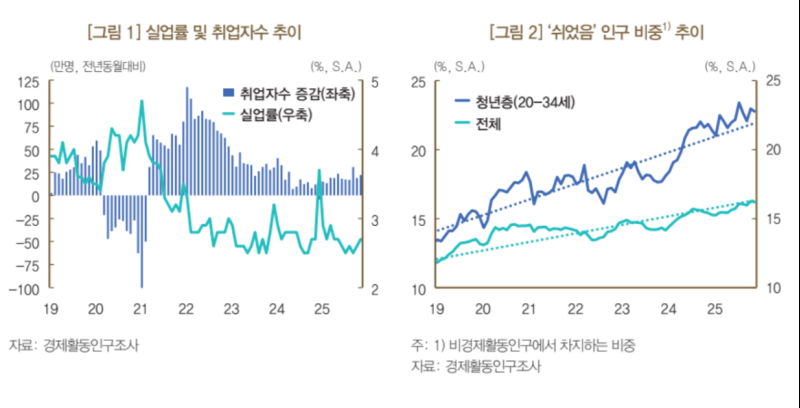 한은이 20일 공개한 '쉬었음 청년층의 특징과 평가' 보고서에 따르면 경제활동인구조사에서 청년층(20∼34세) 비경제활동인구 중 '쉬었음' 상태의 비중은 2019년 14.6%에서 2025년 22.3%로 뛰었다.