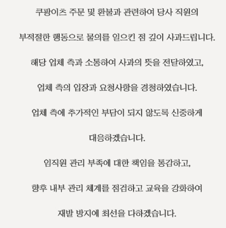 22일 서울 청담동의 A 성형외과는 "쿠팡이츠 주문 및 환불과 관련해 당사 직원의 부적절한 행동으로 물의를 일으킨 점 깊이 사과드린다"고 사과문을 올렸다.