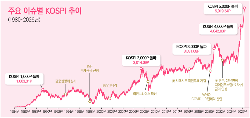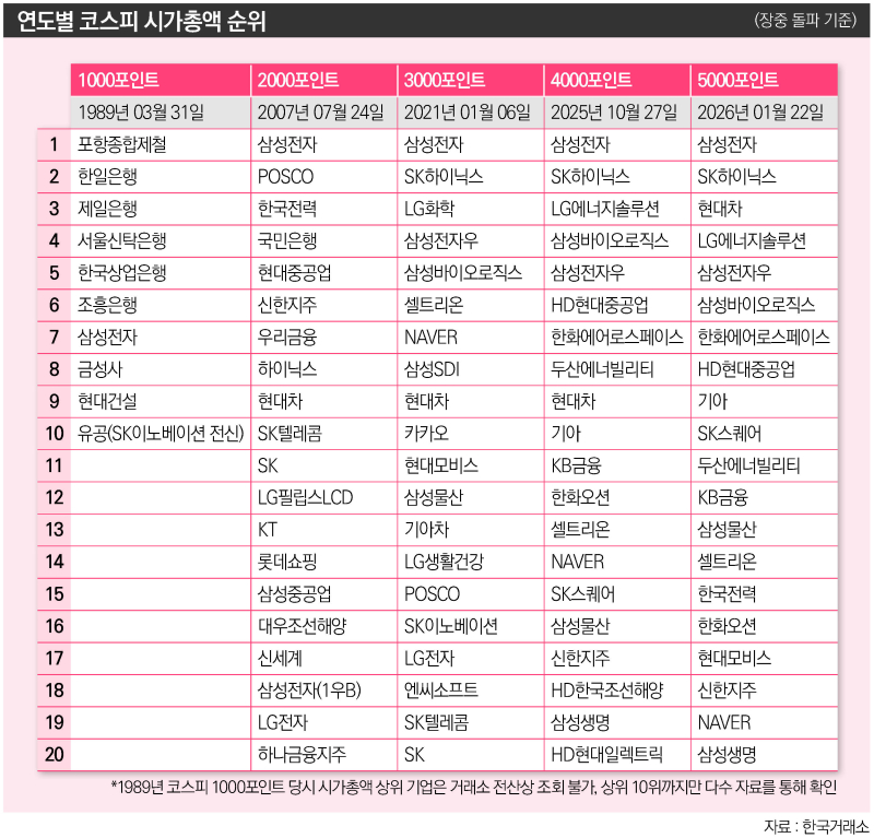 [이코노미스트 이용우 기자] 코스피 지수가 올해 1월 22일 장중 5000포인트를 돌파하며 한국 자본시장은 새로운 이정표를 세웠다. 지난해 4000선을 돌파한 이후 불과 87일 만에 1000포인트가 추가로 상승하며 지수 상승 속도가 과거와 비교해 더 빨라졌음을 보여줬다. 코스피는 한국 경제를 이끈 기업 구성의 변화와 산업 구조의 전환을 압축적으로 보여주는 지표다. 1000 단위로 새 기록을 쓸 때마다 시가총액 상위 기업들의 구성은 크게 달라졌고, 각 시기의 한국 사회와 경제를 둘러싼 환경 변화도 맞물려 나타났다.