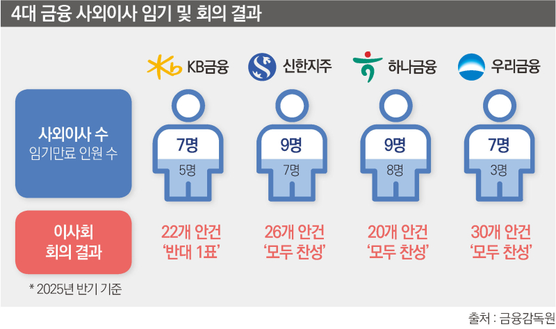 사외이사의 역할을 둘러싼 논란은 이사회 표결 결과에서도 드러난다. 2025년 반기보고서 기준 4대 금융 이사회는 총 27차례의 정기·임시 이사회를 열어 98건의 안건을 심의했지만, 부결된 안건은 단 한 건도 없었다.