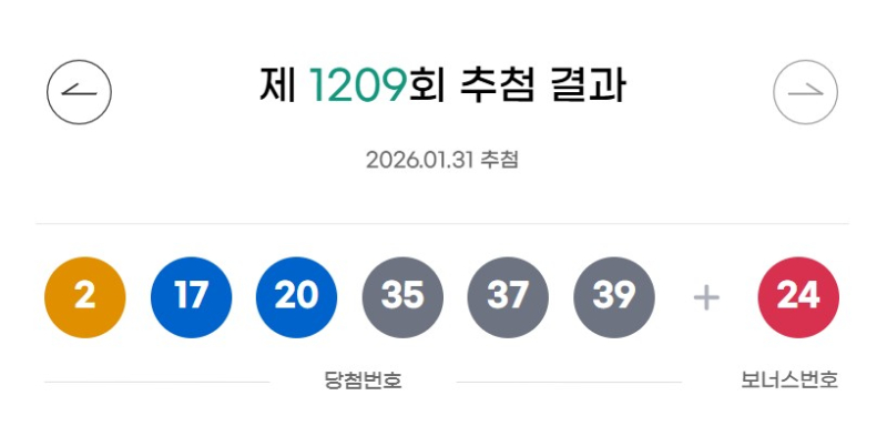 [이코노미스트 강예슬 기자] 로또복권 운영사 동행복권이 제 1209회 동행복권 추첨 결과 ‘2, 17, 20, 35, 37, 39’가 1등 당첨 번호로 결정됐다고 31일 밝혔다. 보너스 번호는 ‘24’다.