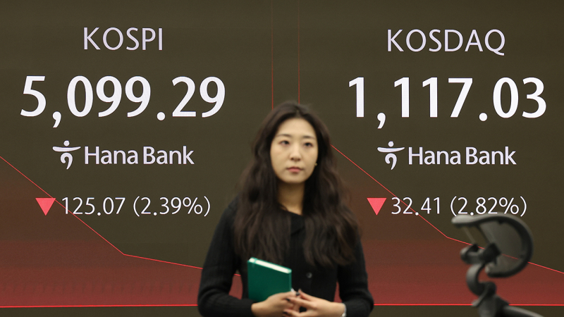 2일 오전 9시 5분 현재 코스피지수는 전 거래일보다 34.92포인트(2.58%) 내린 5,089.44를 기록하고 있다. 지수는 개장과 동시에 1%대 후반의 하락률로 출발한 뒤 낙폭을 키웠다. 오전 9시 3분 기준으로는 전장 대비 133.42포인트(2.55%) 내린 5,090.94까지 떨어지기도 했다.