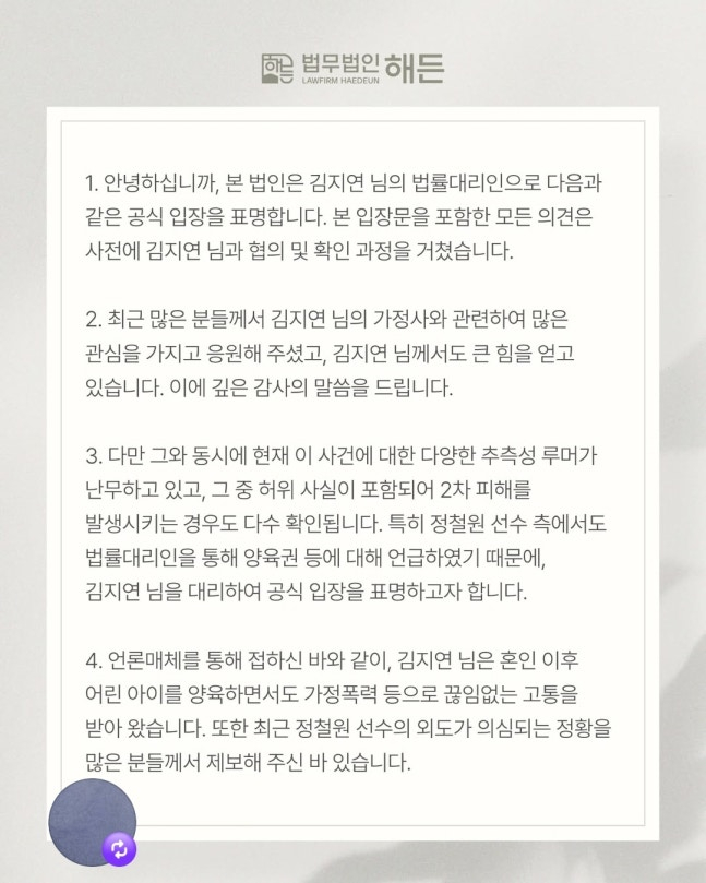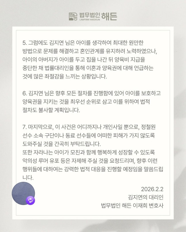 인플루언서이자 정철원의 아내 김지연은 2일 소셜미디어(SNS)에 법무법인 해든이 만든 공식 입장문을 공유했다. 김지연의 법률대리인해든은 "다양한 추측성 루머가 난무하고 있고, 그 중 허위 사실이 포함되어 2차 피해를 발생시키는 경우도 다수 확인된다. 특히 정철원 선수 측에서도 법률대리인을 통해 양육권 등에 대해 언급하였기 때문에 김지연 님을 대리하여 공식 입장을 표명하고자 한다. 김지연 님은 혼인 이후 어린 아이를 양육하면서도 가정폭력 등으로 끊임없는 고통을 받아 왔다. 또한 최근 정철원 선수의 외도가 의심되는 정황을 많은 분들께서 제부해 주신 바 있다"라고 전했다. 이어 "향후 진행될 모든 절차에서 아이를 보호하고 양육권을 지키는 것을 최우선 순위로 삼을 것이며 이를 위해 필요한 모든 법적 절차를 밟을 계획"이라고 강조했다.