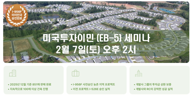 한편 이민법인 대양은 오는 2월 7일 삼성동 본사 대회의실에서 미국투자이민을 주제로 한 설명회를 개최한다. 이번 세미나에서는 EB-5 최신 제도 동향과 투자금 인상 가능성, 농촌 프로젝트의 수속 전략, 그리고 Twin Lakes Georgia 프로젝트에 대한 구체적인 분석이 함께 진행될 예정이다. 세미나 예약은 전화 또는 이민법인 대양 공식 홈페이지를 통해 가능하다.