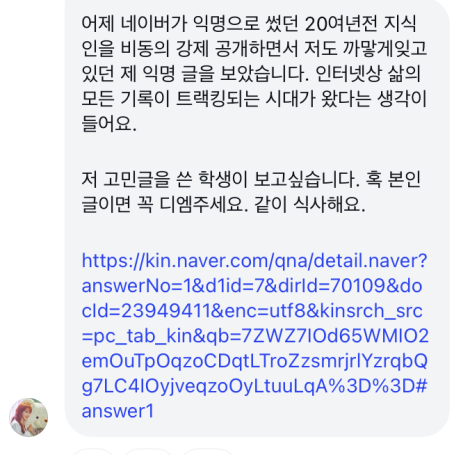 이후 이지영 강사는 "어제 네이버가 익명으로 썼던 20여년 전 지식인을 비동의 강제 공개하면서 저도 까맣게 잊고 있던 제 익명 글을 봤다"며 "인터넷 상 삶의 모든 기록이 트래킹되는 시대가 왔다는 생각이 든다"고 밝혔다.