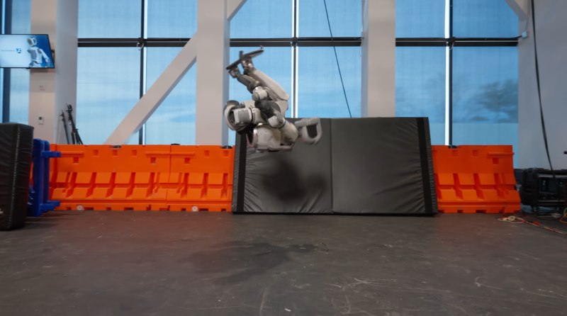 아틀라스가 기존에도 옆돌기와 백 텀블링을 각각 선보인 적은 있었지만, 이번 영상에서는 기계체조 선수처럼 두 동작을 연속해서 유연하게 수행했다. 더욱이 아틀라스는 공중제비의 마무리 동작인 착지도 한치 흔들림 없이 매끄럽고 안정적으로 성공했다.