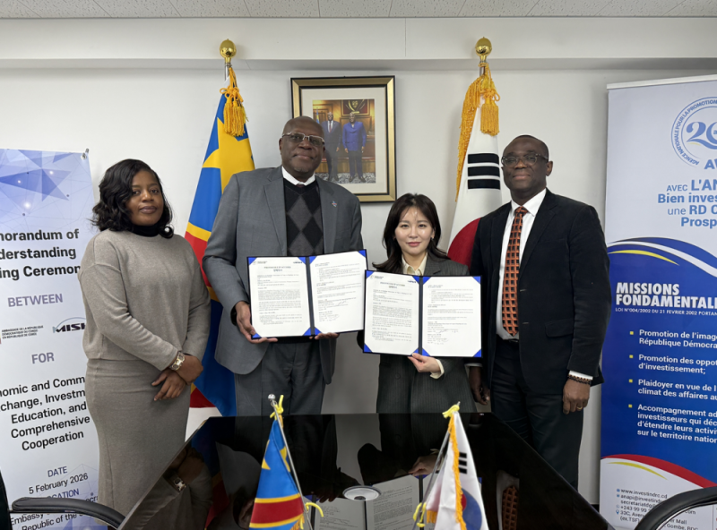 2026년 2월 5일, 주한 콩고민주공화국 대사관과 주식회사 미쉬(MISH Co., Ltd.)는 투자, 상업 교류 및 교육 분야 협력 강화를 위해 주한 콩고민주공화국 대사관에서 업무협약(MOU)을 체결했다. 이번 협약은 대한민국과 콩고민주공화국 간 경제 및 교육 협력의 지속적인 확대를 지원하기 위한 취지로 추진됐다.