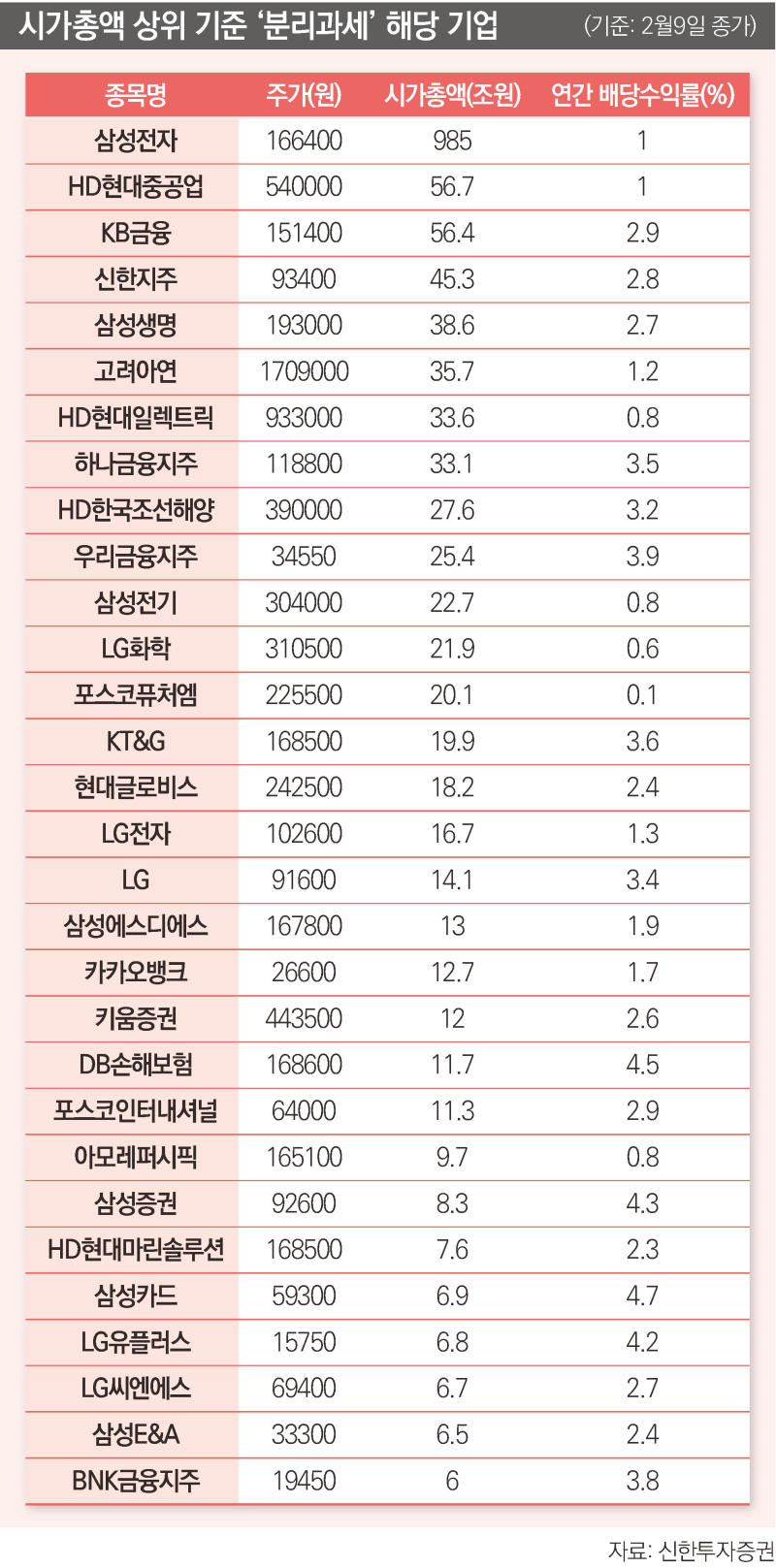 신한투자증권에 따르면 이달 9일 기준 코스피와 코스닥에서 분리과세가 확정된 투자 가능 기업은 총 97개사로 나타났다. 시가총액 상위 순으로는 삼성전자를 비롯해 ▲HD현대중공업 ▲KB금융 ▲신한지주 ▲삼성생명 ▲고려아연 ▲HD현대일렉트릭 ▲하나금융지주 ▲HD한국조선해양 ▲우리금융지주 등이 분리과세 적용 기업에 포함됐다. 상위 10개 기업 가운데 은행과 보험 등 전통적으로 배당을 많이 지급해온 금융사가 절반을 차지했다.