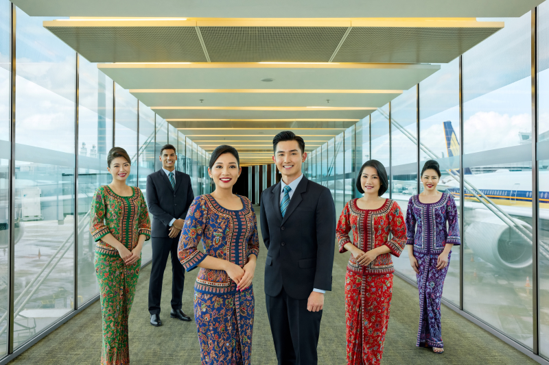 싱가포르항공은 승무원 채용 과정부터 8개가 넘는 아시아 국가 출신 인재들로 구성해 문화적 다양성을 유지하고 있다. 네이비·그린·레드·퍼플로 구분된 색상은 직급과 역할을 시각적으로 드러내고 남성 승무원 역시 넥타이 색상으로 직급을 구분한다.
