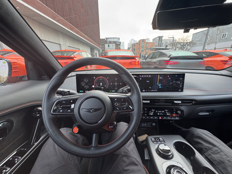 GT 모드를 켜고 주행하면 뒤에서 힘 좋게 차를 미는 느낌이 든다. 제네시스에 따르면 GT 모드는 높은 속도까지 후륜 모터로만 주행할 수 있도록 전력 배분을 조절한다고 한다. 워낙 힘이 좋은 탓에, 묵직한 가속감이 온몸으로 체감됐다. 단순히 치고 나가는 데에만 집중하는 게 아닌, 차량이 쭉쭉 뻗어나갈 때의 적절한 밸런스가 탁월했다.
