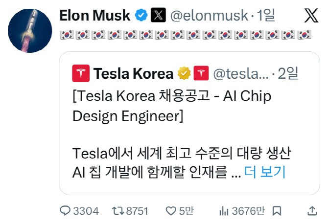 일론 머스크, '태극기' 내걸고 공개 구애 "한국 반도체 인력 필요해"