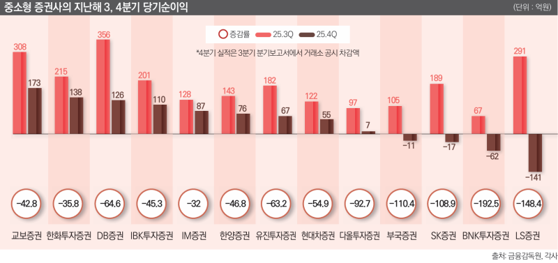 반면 중소형사의 상황은 다소 다른 것으로 나타났다. 지난해 연간 기준으로는 대체로 양호한 실적을 거뒀지만, 4분기만 놓고 보면 적자로 돌아선 곳이 적지 않았기 때문이다. 금융정보업체 에프앤가이드에 따르면 LS증권은 지난해 4분기 141억원의 당기순손실을 기록한 것으로 추정된다. BNK증권과 SK증권, 부국증권 역시 같은 기간 각각 62억원, 17억원, 11억원의 순손실을 낸 것으로 파악됐다. 4분기에 흑자를 낸 중소형 증권사들 역시 순이익이 전분기보다 절반가량 감소했다. 교보증권의 경우 지난해 3분기 308억원의 순이익을 기록했지만 4분기에는 173억원의 순이익을 내며 감소 폭이 큰 것으로 나타났다.