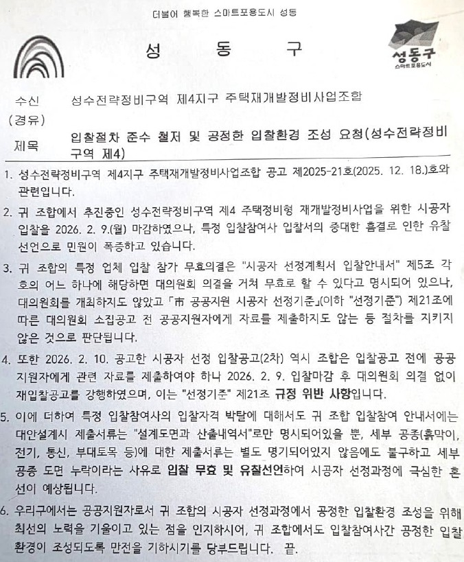 이에 대해 성동구청은 공문을 통해 “시공사 선정계획서 및 입찰안내서에 따르면 입찰 무효는 대의원회 의결을 거쳐야 함에도 관련 절차가 이행되지 않은 것으로 판단된다”고 지적했다.