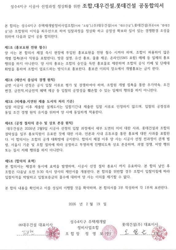 합의서에는 ▲홍보요원 철수와 ▲공정 경쟁 준수 ▲입찰 제안서 공개 개봉 등 시공사 선정 절차의 투명성을 확보하기 위한 내용이 담겼다.
