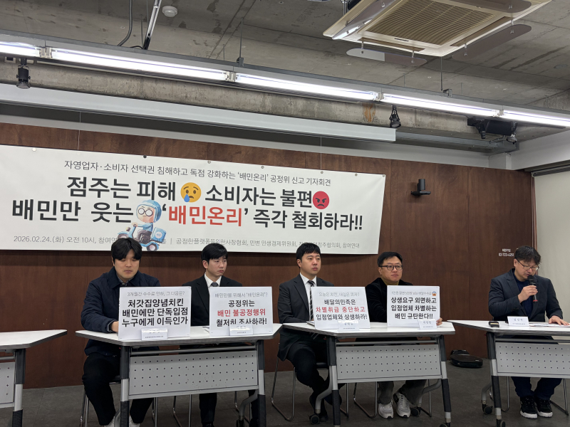 김준형 공정한플랫폼을위한사장협회 의장은 “배민이 여전히 대형 프랜차이즈만 우대하고 영세 자영업자의 상생 요구를 외면한다”며 배민 온리 정책 폐지와 중개수수료 인하 등을 촉구했다.