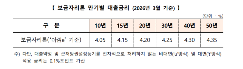 이에 ‘아낌e-보금자리론’ 기준으로 연 4.05(10년)~4.35%(50년)가 적용된다.