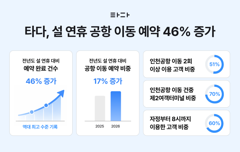 타다에 따르면 이번 설 연휴 기간 인천국제공항 이동 예약 완료 건수는 전년 설 연휴 대비 46% 증가했다. 전체 공항 이동건 중 예약 이용이 차지하는 비중도 전년 동기 대비 17% 늘며 사전 예약 기반 이동 수요가 크게 확대된 것으로 나타났다. 특히 서울 출발 인천공항 이동의 경우 100% 예약 확정 시스템을 운영해 출발 전 배차 불안 요소를 원천 차단했다.