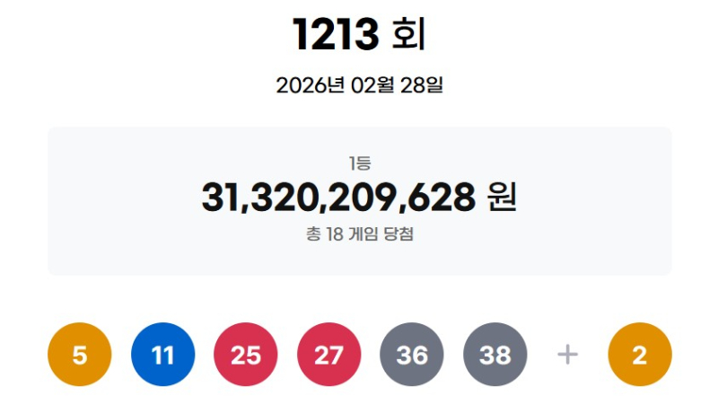1213회 로또 1등 ‘5, 11, 25, 27, 36, 38’…당첨금 각 17억4000만원
