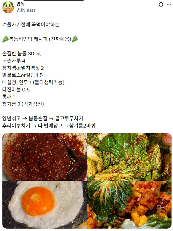 누리꾼들은 "봄동 비빔밥 겨울 가기 전에 꼭 먹어보세요" "너무 맛있어서 코박고 먹었다" "고기 없어도 밥 두 공기 순식간에 해치웠다" 등으로 소감을 전하고 있다.