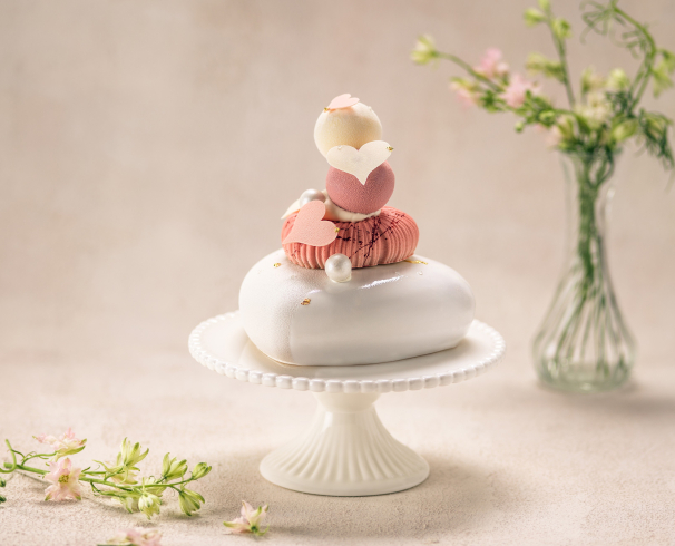 케이크는 매트한 화이트 글레이즈로 마감된 하트 형태의 베이스 위에 하트 모양의 미니 핑크 무스 케이크를 올리고, 그 위에 딸기 무스와 바닐라 무스를 구 형태로 층층이 쌓아 올린 조형적인 디자인이 특징이다. 하트 모양 화이트 초콜릿 장식과 은은한 진주 디테일, 금박 포인트가 더해져 우아하면서도 로맨틱한 분위기를 완성한다.