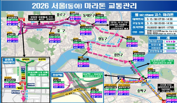 구체적인 교통통제 시간 및 우회구간 등은 120 다산콜센터 및 2026 서울마라톤대회 사무국, 서울경찰청 교통정보 안내전화 및 교통정보센터 홈페이지·카카오톡을 통해 확인할 수 있다.
