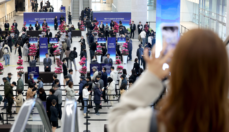 '싱글벙글' 삼성전자 주총장..."주가 올라 행복합니다"