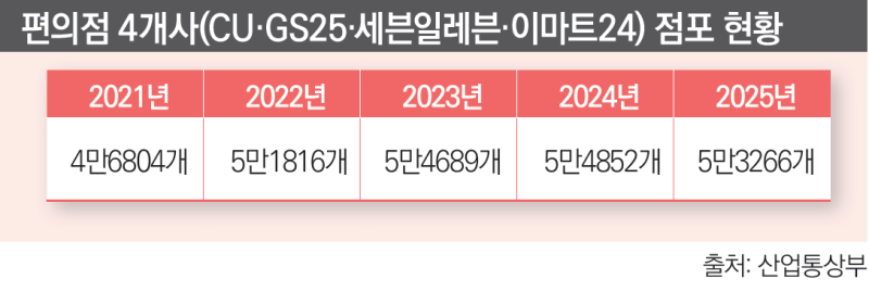 지난 2024년부터는 성장 둔화의 폭이 더 커졌다. 당해 편의점 4개사의 점포 증가율은 1%도 되지 않았다. 편의점 4개사의 2025년 점포 수는 전년 대비 약 1600개 줄어든 5만3266개로 집계됐다. 업계의 점포 역성장세는 36년 만에 처음이다.