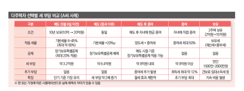 이처럼 매도와 증여, 보유 모두 장단점이 뚜렷한 상황에서 다주택자의 선택은 단순한 절세 문제가 아닌 전략의 영역으로 이동하고 있다. 단기적으로는 매도가 유리할 수 있지만, 자산 이전이나 장기 보유를 고려할 경우 선택에 따라 결과가 달라질 수밖에 없다.