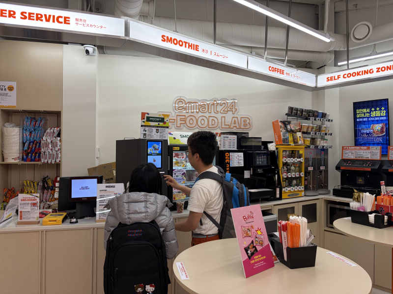 라면 아카이브 월 옆에는 외국인 관광객이 ‘진짜’ 한국식 라면 문화를 경험할 수 있도록 김치를 비롯해 김밥, 떡볶이 등 다양한 분식류를 함께 배치했다. 후식으로 즐길 수 있는 과일 스무디 기계와 커피 머신도 설치했다.