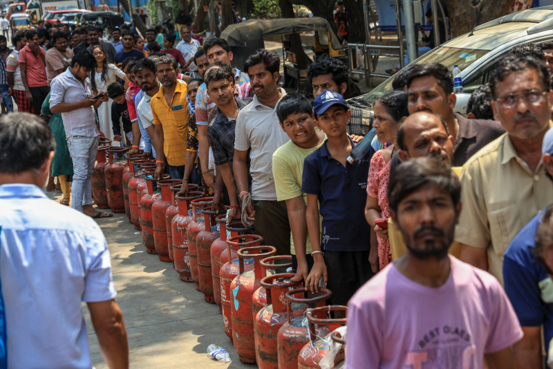 인도 국민들이 2026년 3월 26일 뭄바이의 가스 기관 사무실 근처에서 빈 액화석유(LPG) 실린더를 채우기 위해 줄을 서 있다. 중동 분쟁 고조로 인해 걸프 지역에서 선적이 중단되면서 전국적으로 LPG 공급 차질이 발생하고 있다. [사진 EPA/연합뉴스]