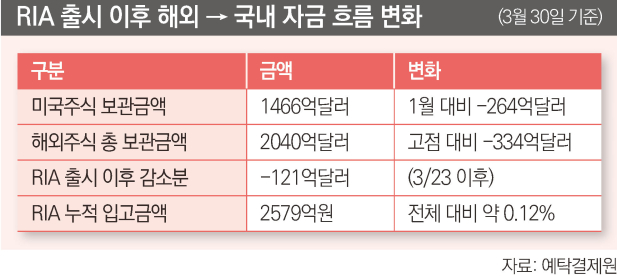 실제 자금 이동 규모 역시 아직 제한적인 수준에 머물러 있다. 한국예탁결제원 세이브로에 따르면 국내 투자자의 미국 주식 보관금액은 3월 30일 기준 1466억달러로, 1월 말 최고치(1730억달러) 대비 264억달러 감소했다. 같은 기간 전체 해외주식 보관금액도 2374억달러에서 2040억달러로 334억달러 줄어들며 글로벌 투자 자산 규모 자체가 축소된 흐름을 보였다. 이 가운데 RIA 도입 이후 일부 자금 재배치 움직임도 감지된다. 제도 시행일인 3월 23일 당시 1587억달러였던 미국 주식 보관금액은 이후 121억달러 줄어들며 정책 시행과 맞물린 변화 가능성을 시사했다.