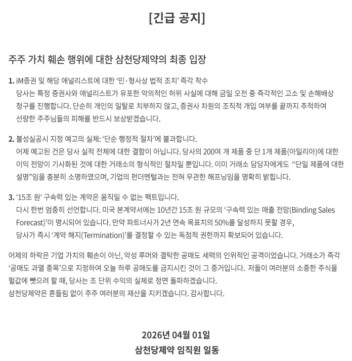 삼천당제약은 전날에도 전인석 대표이사 이름으로 긴급 메시지를 공지하며 "시장의 일시적인 오해가 당사가 이미 확보한 15조원의 압도적 가치를 결코 바꿀 수는 없다"며 "저희는 묵묵히 계약과 실적이라는 가장 확실한 결과로 주주 여러분의 믿음에 반드시 보답하겠다"고 강조했다.