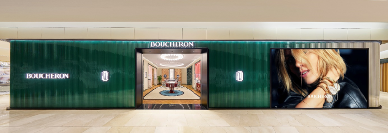 이번 인천 부티크 역시 파리 방돔 광장 26번지에서 출발한 부쉐론의 정체성을 반영했다. 외관은 그린 톤 메탈과 미러 프리즘을 조합해 보석의 면처럼 빛이 다양한 각도로 반사되도록 설계했다. 브랜드의 상징인 그로그랭 디테일과 시그니처 그린 컬러도 현대적으로 풀어냈다. 입구의 윈도우 디스플레이는 아이코닉한 주얼리를 강조하고, 내부는 블랙 몰딩과 메탈 소재를 더해 균형감 있는 분위기를 만든다.
