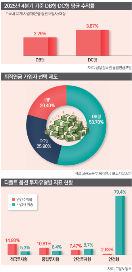 금융감독원에 따르면 2025년 말 기준 국내 퇴직연금 적립금은 확정급여형(DB), 확정기여형(DC), 개인형 퇴직연금(IRP) 합산으로 496조8021억원을 기록했다. 500조원에 육박하는 자산을 형성하게 됐지만 수익률은 초라하다. 통합연금포털 퇴직연금 비교공시에 따르면 지난해 4분기 기준 국내 42개 사업자(은행·증권·보험사)의 DB형 평균 수익률은 2.79%, DC형은 3.87%를 기록한 것으로 나타났다. DB형, DC형 모두 평균 수익률이 2~4% 수준에 그치고 있다.
