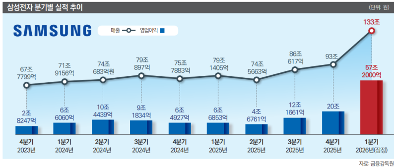 [이코노미스트 원태영 기자]삼성전자가 올해 1분기 매출액 133조원, 영업이익 57조2000억원으로 역대 최대 실적을 기록했다. 지난해 4분기 매출 93조원, 영업이익 20조원으로 최대 실적 기록을 세운 데 이어 이번에도 깜짝 실적으로 2분기 연속 기록 경신 행진을 이어갔다. 국내 기업 최초로 분기 매출 100조원도 달성했다. 인공지능(AI) 반도체 초호황기에 따른 주력 메모리 수요 급증과 반도체 칩 가격 폭등, 고환율 영향으로 분석된다.
