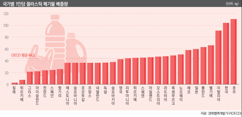경제협력개발기구(OECD)가 지난해 11월 공개한 ‘한눈에 보는 환경 지표’에 따르면 조사에 포함된 30개 회원국 중 한국의 1인당 플라스틱 폐기물 배출량은 103.9㎏으로 2위를 차지했다. OECD 평균인 44.2㎏의 두 배 이상이다.