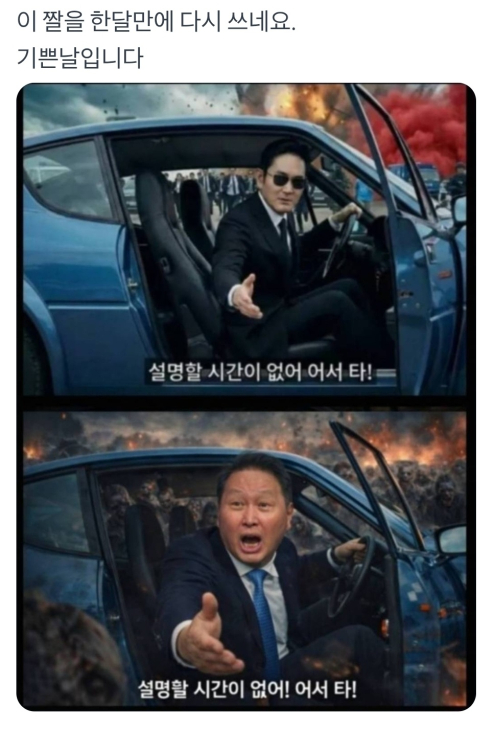 한 투자자는 이 회장과 최 회장에 자동차 운전석에 앉아 "섦여할 시간이 없어! 어서 타!" 라고 말하는 총수밈을 소환하며 "이 짤(이미지)을 한달 만에 다시 쓰네요. 기쁜 날입니다" 라고 밝혔다.