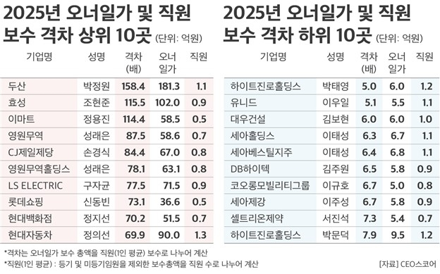 지난해 대기업집단 오너일가 중 총수와 직원 간의 보수 격차가 100배 이상인 곳은 두산, 효성, 이마트 3곳인 것으로 나타났다. 박정원 두산그룹 회장, 조현준 효성그룹 회장, 정용진 신세계그룹 회장이 주인공이었다.