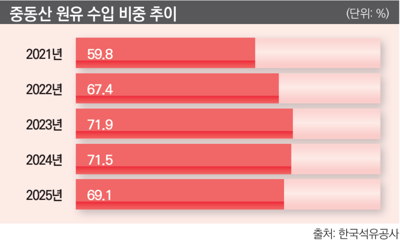 중동 쇼크로 한국의 에너지 안보에도 빨간불이 켜졌다. 중동산 원유 의존도가 절반을 넘어서기 때문이다. 한국석유공사 등에 따르면 지난해 전체 원유 수입량은 10억2800만배럴이다. 이 가운데 중동산 원유 비중은 70%에 달했다. 중동산 원유 의존도가 80%를 웃돌던 과거 대비 개선됐다고 하지만 여전히 높은 편이다.