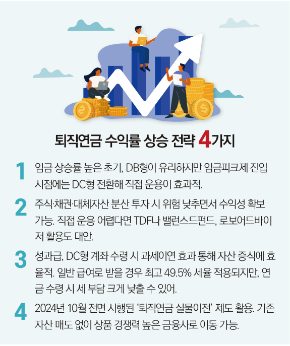 우선 개인 차원에서는 퇴직연금을 더 이상 ‘회사에 맡긴 돈’으로 방치해서는 안 된다. 임금 상승률과 기대 투자수익률을 비교해 DB형과 DC형 중 유리한 구조를 선택할 필요가 있다. 임금 상승률이 높은 초기에는 DB형이 유리할 수 있지만, 임금피크제 진입 시점에는 DC형으로 전환해 직접 운용하는 전략이 효과적이다.