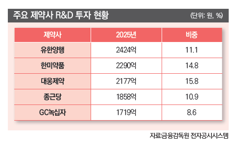 금융감독원 전자공시시스템에 따르면 2025년 기준 주요 제약사들은 전반적으로 R&D 투자 기조를 이어가고 있다. 유한양행은 연구개발비 2424억원으로 매출 대비 비중이 11.1%를 기록했고, 대웅제약은 2177억원으로 15.81%를 나타냈다. GC녹십자는 연구개발비 비중이 8.6%로 다소 낮아졌다.