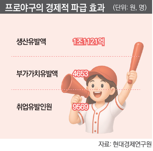 현대경제연구원은 “프로야구는 소비 증대를 통한 직접적인 내수 활성화 효과가 크다”면서 “최근 역대 최다 관중 기록을 세우는 등 프로야구의 흥행 열기가 고조되며 구단 연고지를 중심으로 경제 활성화에 미치는 영향이 확대될 것”이라고 내다봤다.