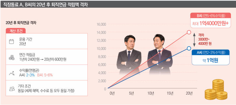 그 결과 20년 뒤 A씨의 수익률은 연 2~3% 수준에 머문 반면, B씨는 연 5~6%대 수익률을 기록했다. 결국 A씨의 퇴직연금 적립금은 약 1억원 수준에 그친 반면, B씨는 최대 1억4000만원을 넘어섰다. 수익률 차이는 3%포인트(p)에 불과했지만, 누적 자산 격차는 3000만~4000만원까지 벌어졌다.