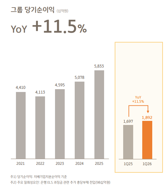 우선 주요 계열사인 KB국민은행의 2026년 1분기 당기순이익은 1조1010억원으로 전년동기 대비 7.3% 증가했다. 전년 동기 일회성 대규모 충당금 전입 등의 기저효과가 소멸되고, 이자이익이 안정적으로 관리된 가운데 자산관리 수수료이익이 확대된 영향이다.
