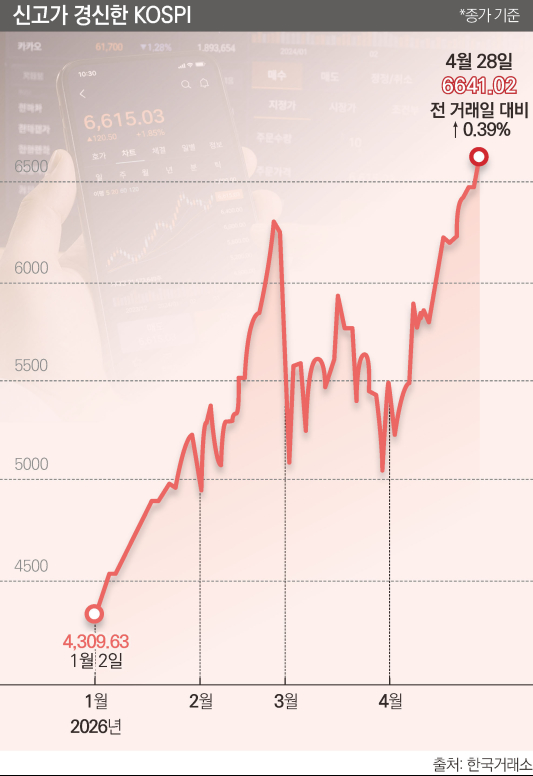 한국거래소에 따르면 코스피는 4월 29일 6690.90으로 장을 마감하며 사상 최고치를 경신했다. 불과 한 달 전인 3월 31일 종가 5052.46과 비교해 약 32.42% 급등했다. 중동 전쟁 발발 이전 기록한 종전 최고치 6307.27도 훌쩍 넘어섰다. 전쟁 국면에서 나타났던 급락과 반등, 이른바 ‘롤러코스터 장세’를 마무리하고 다시 강한 상승 추세가 나타난 것이다.