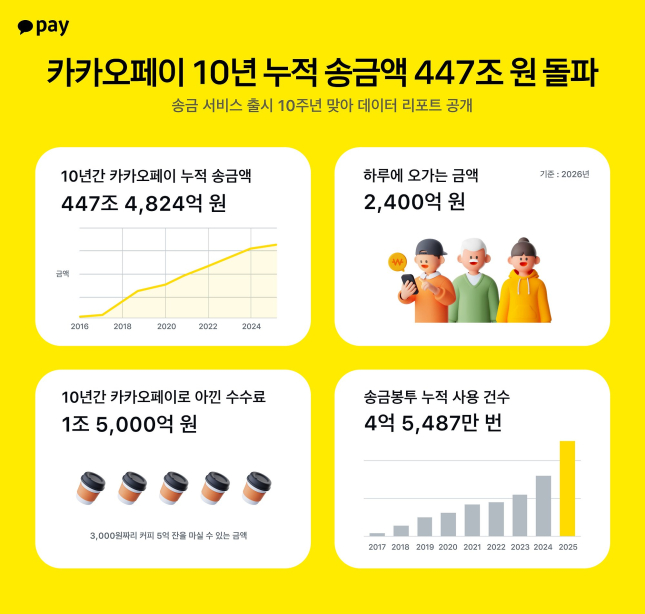 카카오페이 송금의 지난 10년간 누적 송금액은 약 447조원에 달한다. 이는 2026년 대한민국 국가 예산의 약 60%를 상회하는 규모다. 전 국민이 매일 1200억원, 매 시간 50억원을 카카오페이를 통해 주고받은 셈이다.
